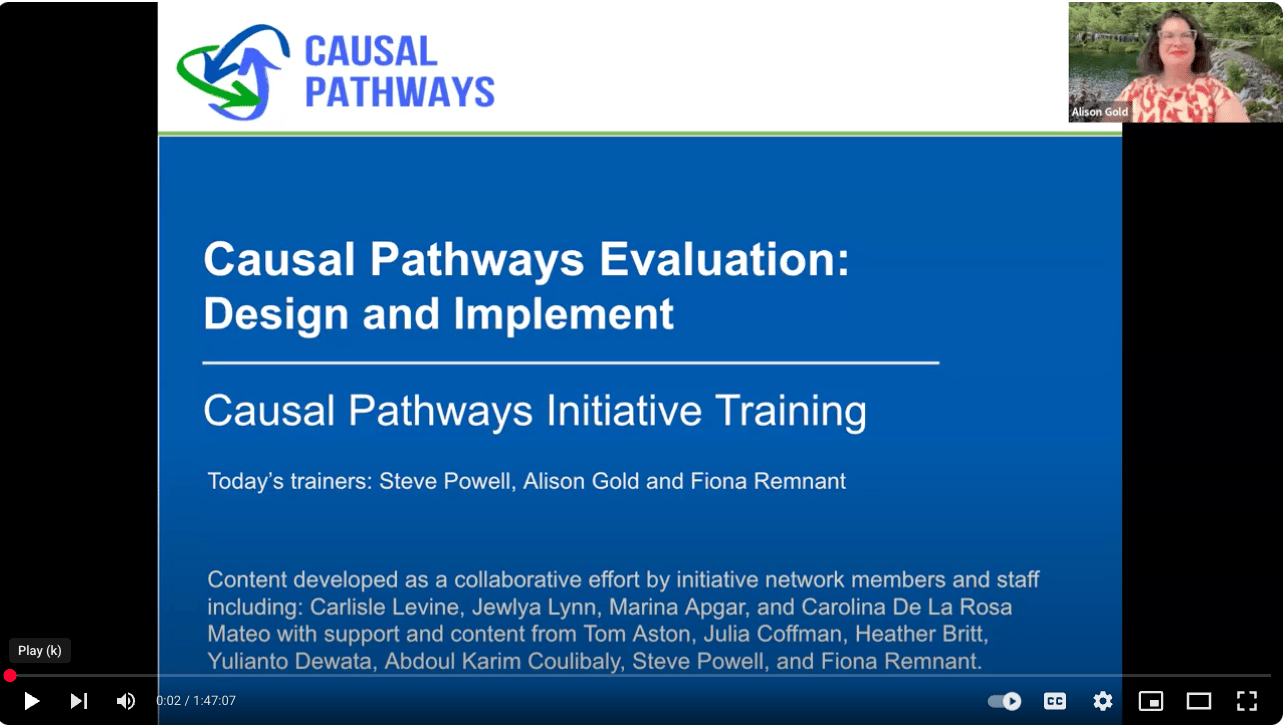 On June 3, Alison Gold co-facilitated the third in a series of Causal Pathways 101 Virtual Trainings, The Nitty Gritty of a Causal Pathways Evaluation Design and Implementation, with Fiona Remnant and Steve Powell. Over 200 folks registered for the session and it along with the other two virtual trainings - on Understanding and Getting Ready for Causal Pathways Evaluation and Values-Driven Causal Pathways Evaluations: Strengthening Rigor and Quality - are available to watch for free on the Causal Pathways website!